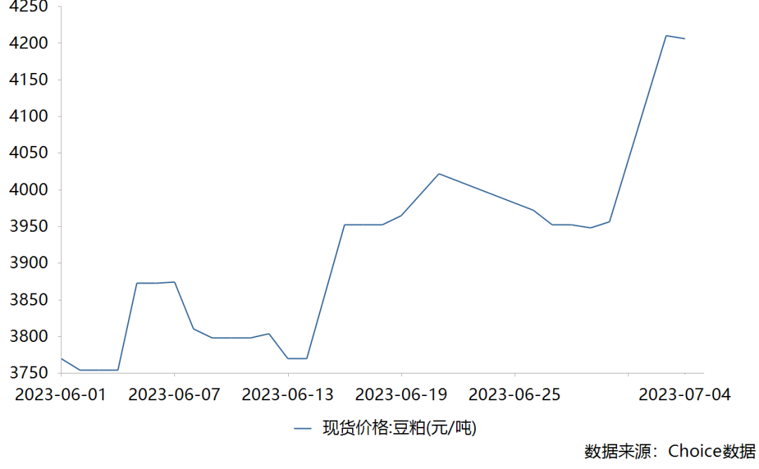 Choice數據監測顯示,近期豆粕突然持續性上漲,相較于6月1日的3770元/噸,截至目前,已經觸及4200元/噸高點,單月漲幅超過11%。