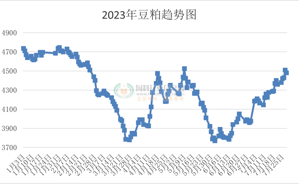 美豆產區潛在利多天氣繼續提振油廠挺粕,豆粕現貨市場保持強勢運行。其中至7月底豆粕期價一舉突破4300元,國內豆粕現貨均價至4500元/噸左右。其中,截至到7月27日豆粕現貨均價為4510元/噸,較6月底3975元/噸,上漲了535元/噸。