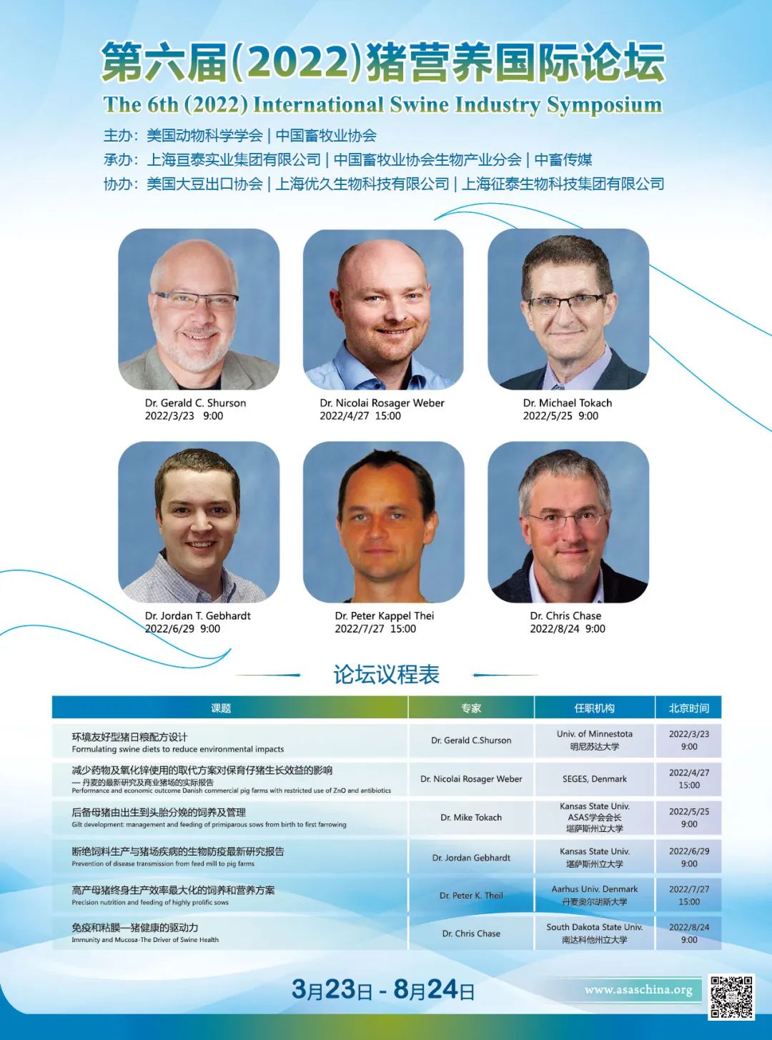 第六屆(2022)豬營養國際論壇,以“展望營養科技的應用對養豬行業可持續性的幫助”為主題,邀請到世界動物營養領域的知名專家、學者,進行零距離對話。這將是一次國際的、權威的、前沿的豬營養國際學術盛會,也將是一次業界領軍人物智慧激蕩的饕餮盛筵!